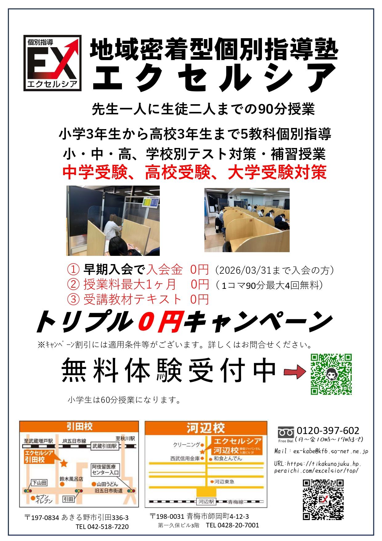 地域密着型 青梅市・あきる野市の 個別指導エクセルシアでは 地域面倒見No1を目指して お子様の個性に合わせた授業を 行っております。 「百聞は一見にしかず」まずは 無料体験で!! | |